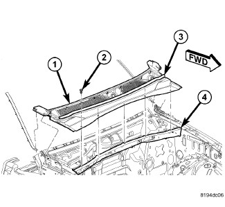 16. Install the four push pins (2) through the cowl grille (1) and into the body (4).