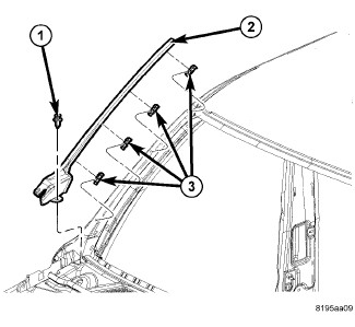 13. Install the windshield A-pillar molding (2) and clips (3) to the windshield A-pillar.