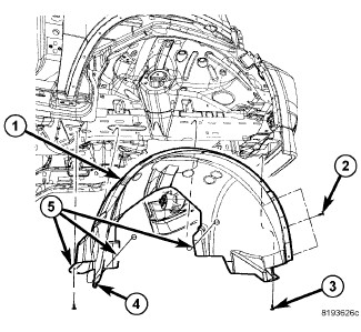 3. Align and install three push pins (5) into holes in the wheel house liner and fender inner wheelhouse.