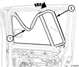 3. Seat the lower front part of the run channel (1) fully into the door channel.