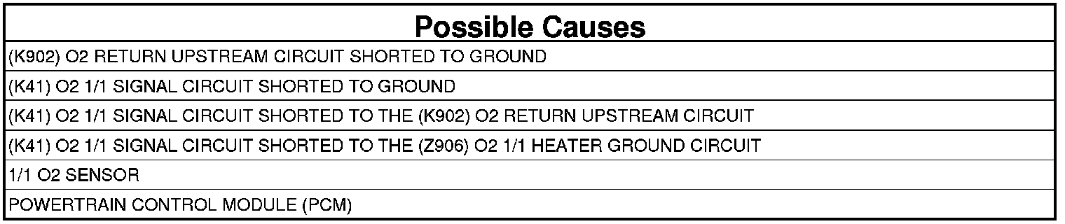 7. (K41) O2 SENSOR 1/1 SIGNAL CIRCUIT SHORTED TO THE (Z906) O2 1/1 HEATER GROUND CIRCUIT