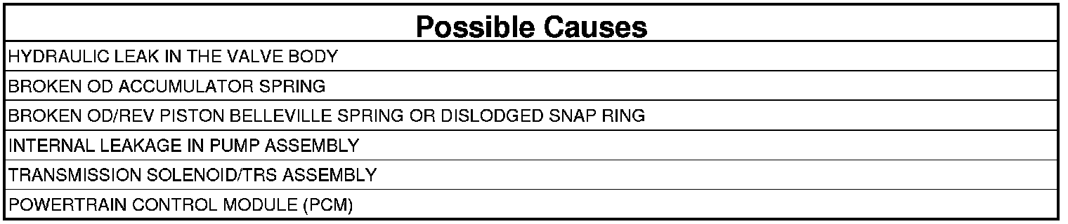 - Repair internal transmission. Pay attention to the OD Clutch. Broken or weak return spring or a dislocated snap ring could cause this problem. If no problems were found in the OD clutch, or if leakage into the OD passage was noted, replace Pump Assembly.