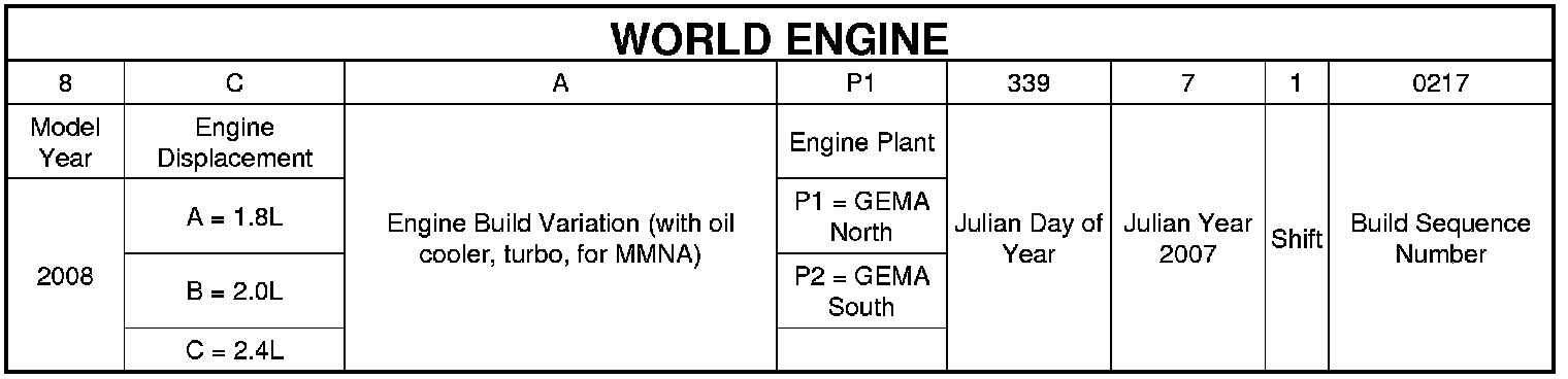 oil pan and the bellhousing. The serial number contains engine build date, build location, and displacement.