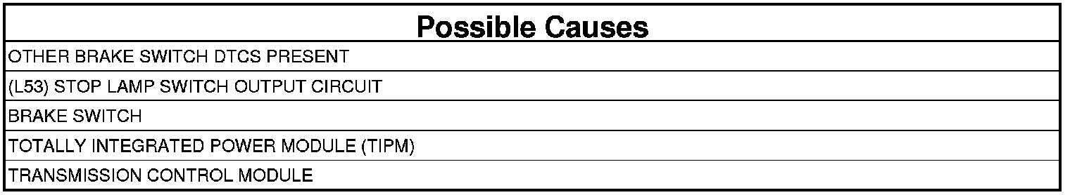 - Check the (L53) Stop Lamp switch output circuit between the brake switch and the TIPM for an open or short to ground.