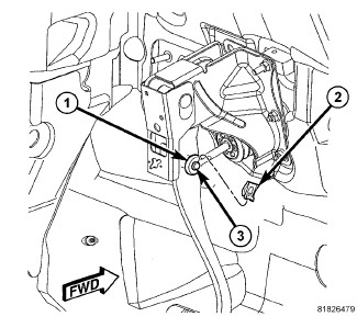 6. Install the power brake booster push rod (1) on the pin (3) mounted on the side of the brake pedal. Install a NEW retaining clip (2) on the end of the pin. Do not reuse the old clip.