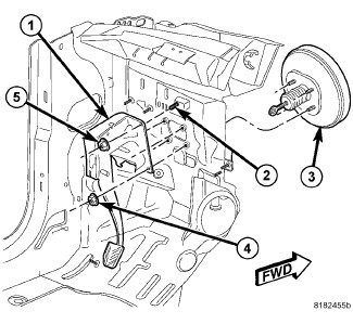 3. Install the remaining nut (5) attaching the brake pedal (1) to the dash panel. To tighten this nut (and the other four from the preceding step), refer to the following step.