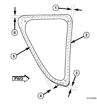 2. Apply bead (5) of adhesive with a triangular nozzle directly to the quarter glass seal starting at bottom in center of the quarter glass.