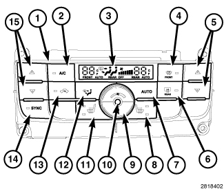 - a push button automatic mode control (7) to set the heating-A/C system to Auto mode. AUTO appears in the VF digital display when the system is in Auto mode.