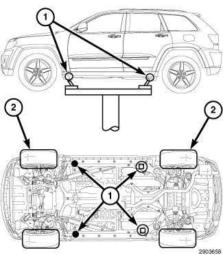 When properly positioned, a floor jack can be used to lift the vehicle and support the raised vehicle with jack stands.
