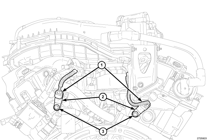 1. Install the ignition coil capacitor (2) and bolt (3). Tighten the bolt to 10 Nm (89 in. lbs.).