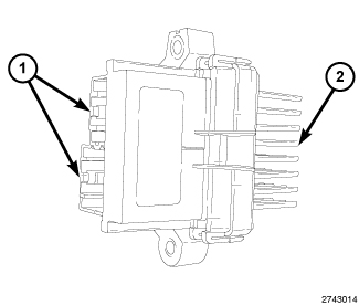 The blower motor power module is mounted to the passenger side of the HVAC housing, near the blower motor. The blower motor power module consists of a molded plastic housing with mounting plate and two integral connector receptacles (1). Concealed behind the mounting plate is the power module electronic circuitry and a multiple, cylindrical finned, heat sink (2).The blower motor power module is accessed for service from under the instrument panel.