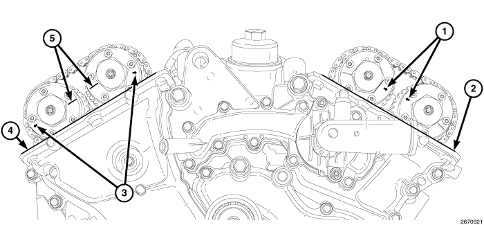 4. While maintaining this alignment, verify that the arrows on the left side cam phasers (1) point toward each other and are parallel to the valve cover sealing surface (2) and that the right side cam phaser arrows (3) point away from each other and the scribe lines (5) are parallel to the valve cover sealing surface (4).