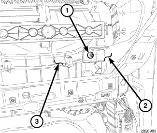 5. Remove the nut (1) that secures the passenger side end of the HVAC housing (3) to the instrument panel support (2).