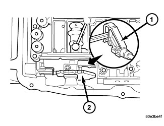 2. Insert selector valve (1) in driver of detent plate (2). When installing the electrohydraulic control module in the transmission housing, the plastic part of the selector valve (1) must engage in the driver of the detent plate (2).