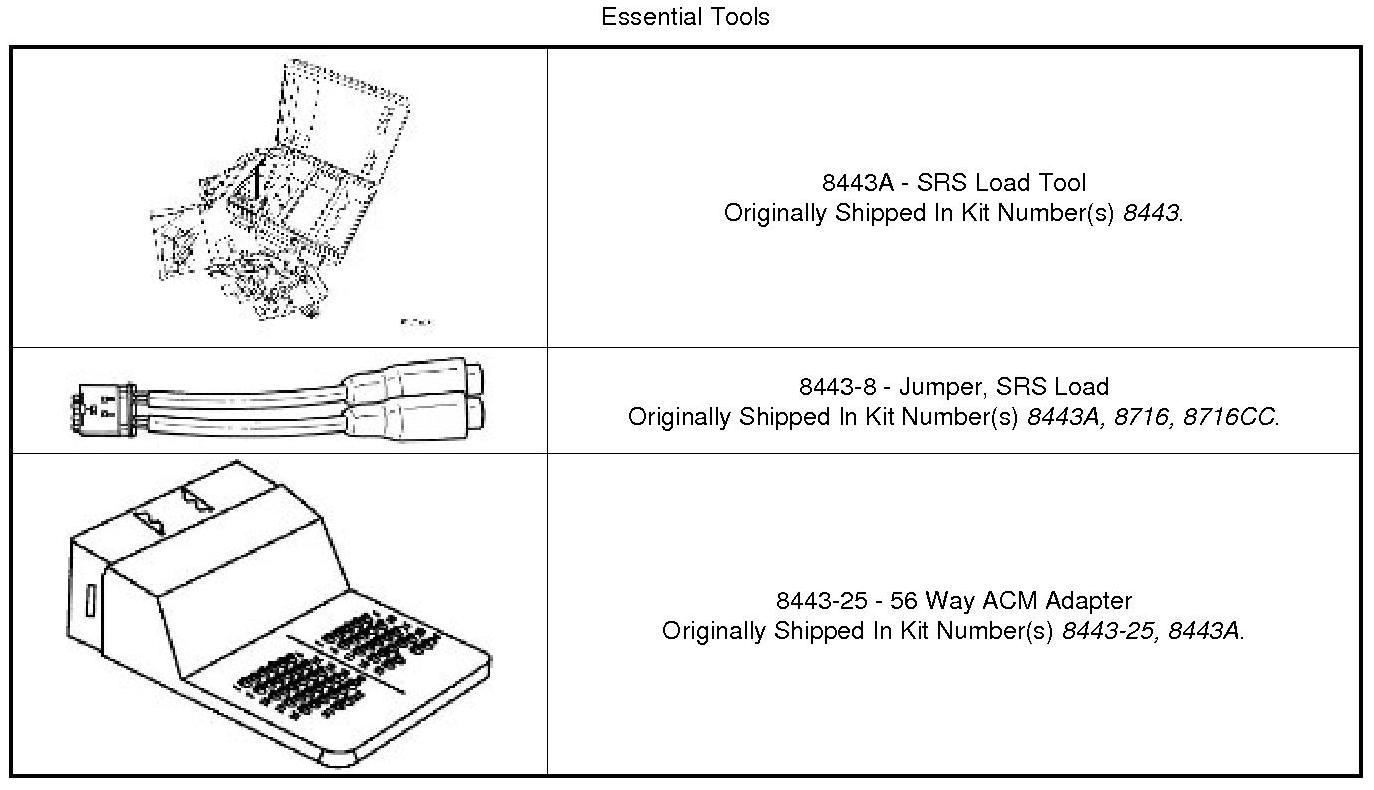 When powered, the Occupant Restraint Controller (ORC) sends a test current to the squibs to verify the integrity of the squib and wiring. These circuits are maintained in a "floating" configuration at the ORC (connected to neither power nor ground) as protection against inadvertent deployment. Use of the Supplemental Restraints System (SRS) Load Tool Kit 8443A in the tests below substitutes a suspect squib with a known good component. The SRS Load Tool Adapter provides a test point as well as a method for opening the shorting bar connections within the ORC harness connector.