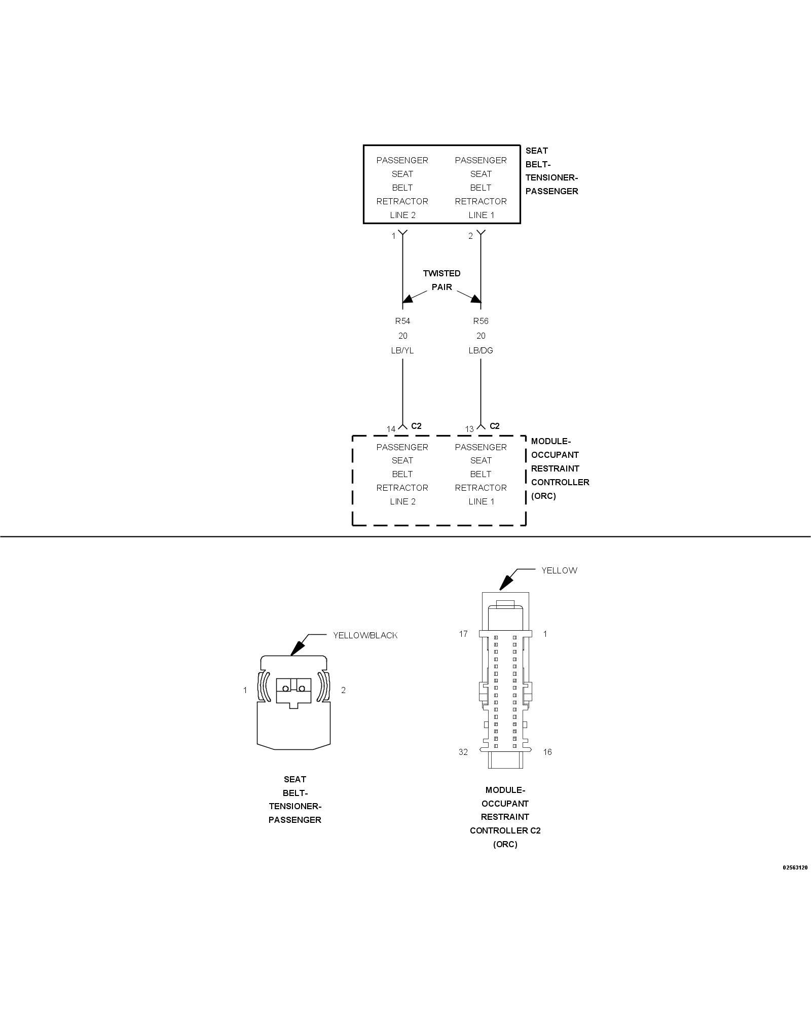 The Occupant Restraint Controller (ORC) monitors the resistance of the Passenger Seat Belt Tensioner circuits. The ORC will set this DTC if it detects low resistance on the Passenger Seat Belt Tensioner circuits.