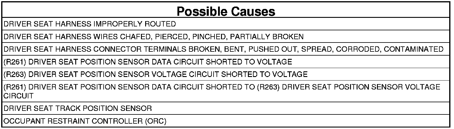 7. CHECK (R261) DRIVER SEAT POSITION SENSOR DATA CIRCUIT FOR A SHORT TO (R263) DRIVER SEAT POSITION SENSOR VOLTAGE CIRCUIT