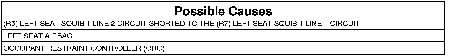 4. CHECK (R5) LEFT SEAT SQUIB 1 LINE 2 CIRCUIT FOR A SHORT TO (R7) LEFT SEAT SQUIB 1 LINE 1 CIRCUIT