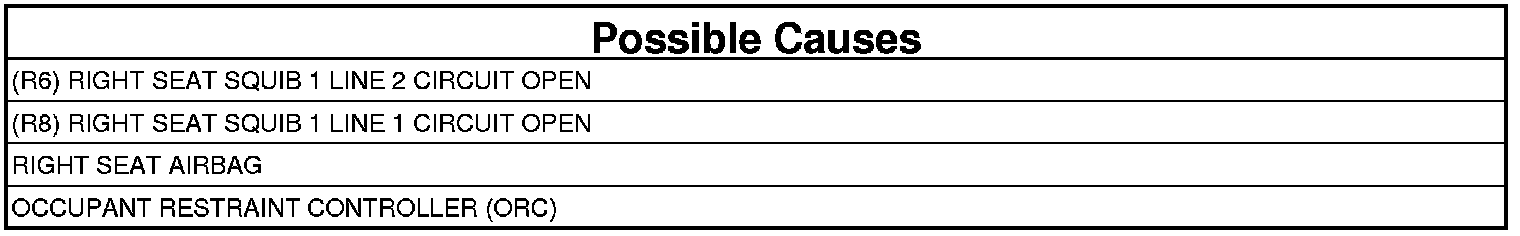 4. CHECK (R8) RIGHT SEAT SQUIB 1 LINE 1 CIRCUIT FOR AN OPEN