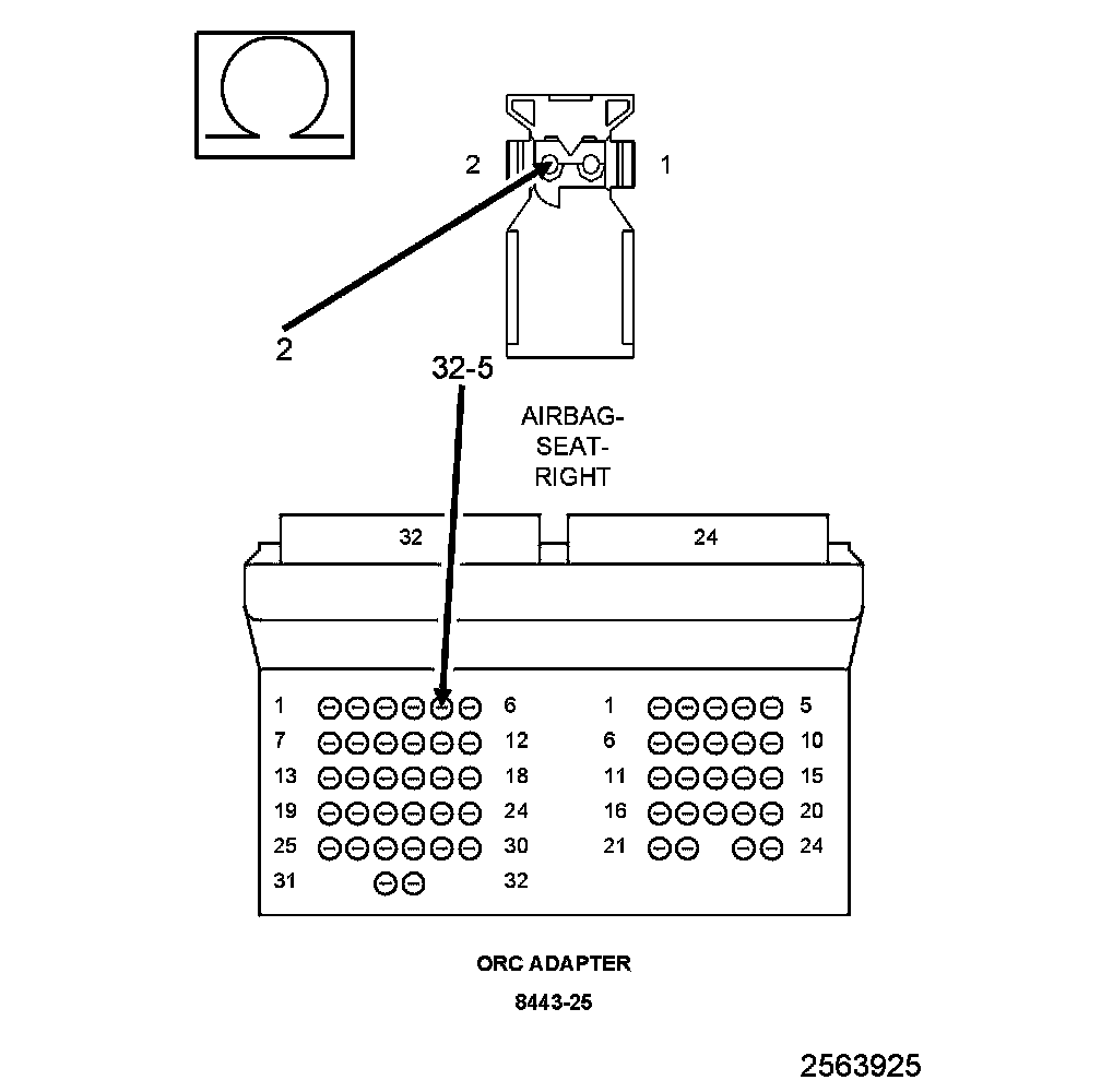 4. Measure the resistance of the (R8) Right Seat Squib 1 Line 1 circuit between the Right Seat Airbag connector cavity 2 and the SRS Load Tool Adaptor cavity 32-5.