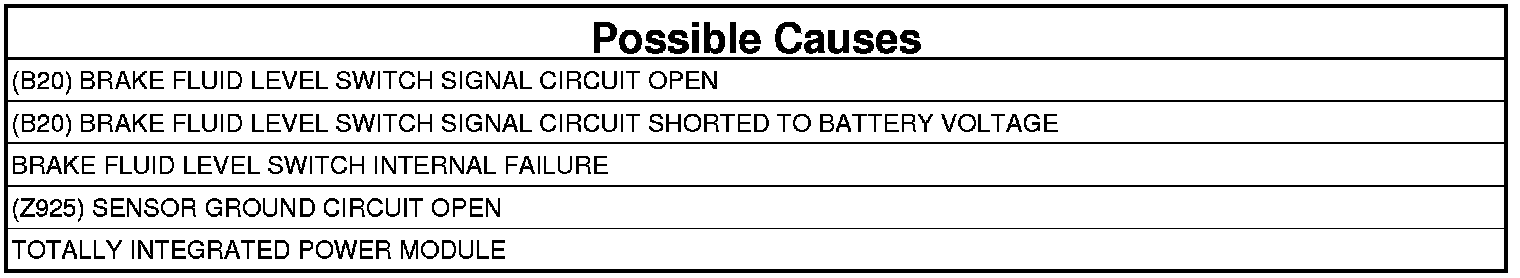 - Repair the (B20) Brake Fluid Level signal circuit for a short to voltage.