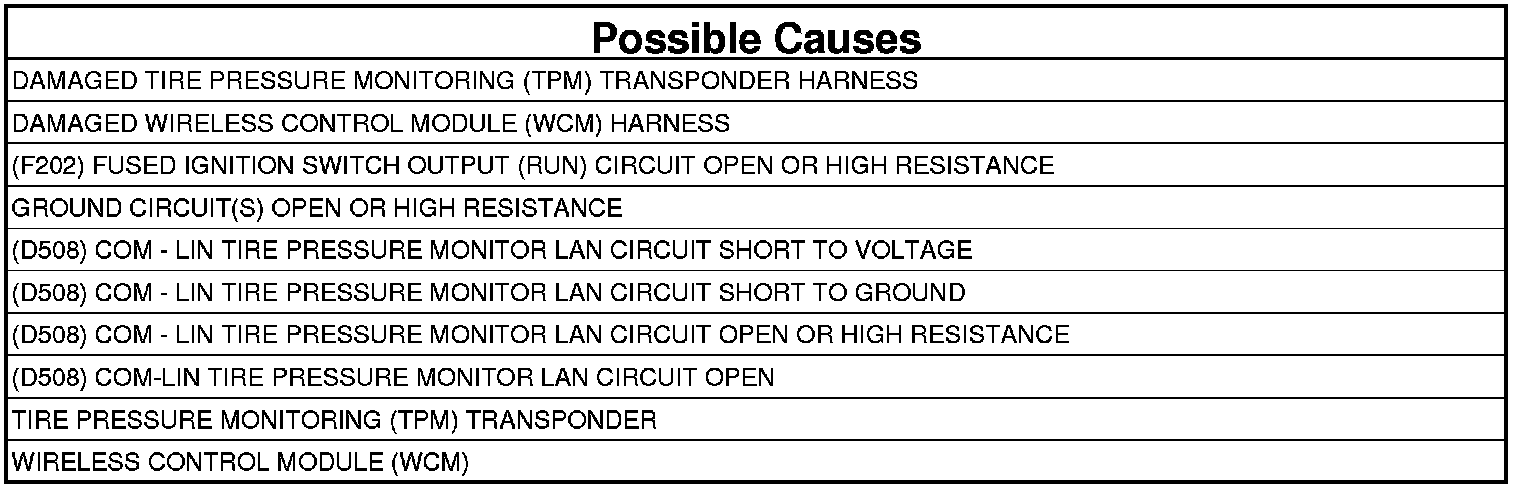 - Repair the (D508) COM - LIN Tire Pressure Monitor LAN circuit for a short to voltage.