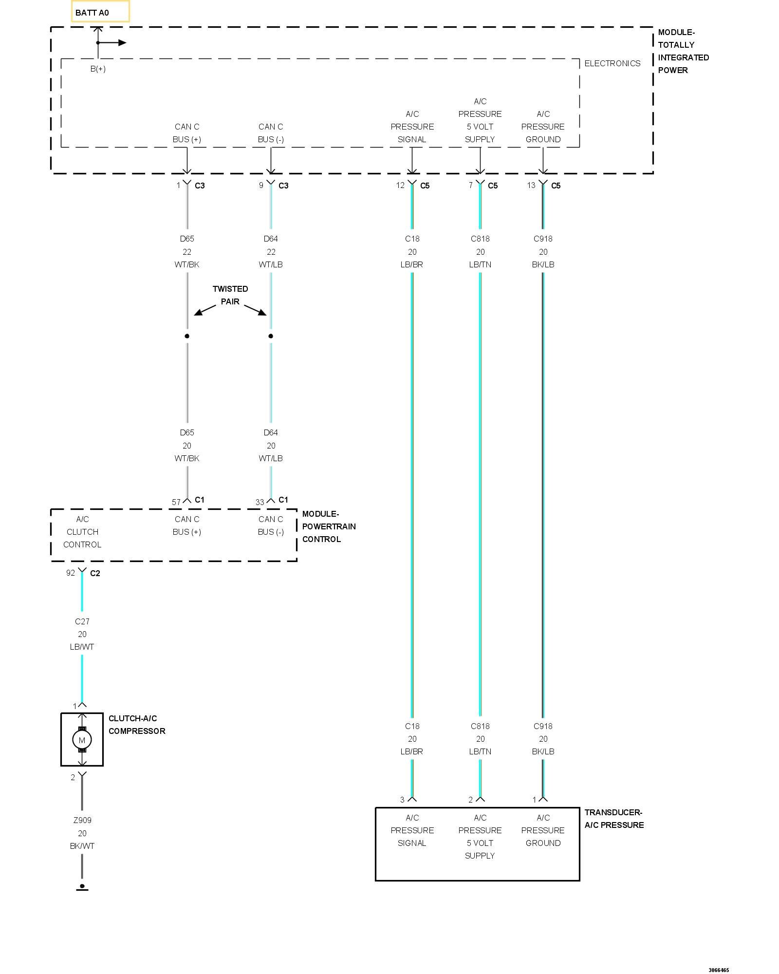1. Using the wiring diagram/schematic as a guide, inspect the wiring and connectors between the A/C Pressure Transducer and the Totally Integrated Power Module (TIPM).