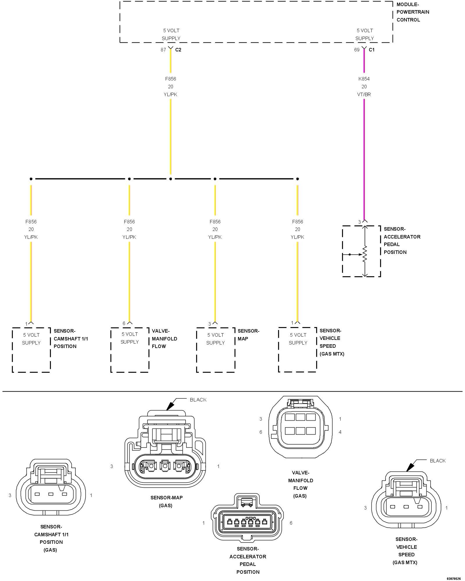 1. Inspect the (F856) 5-Volt Supply circuit between the Camshaft 1/1 Position Sensor harness connector and the PCM harness connector.