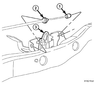 5. Connect the hood latch cable (1 and 2) to the hood latch (3).
