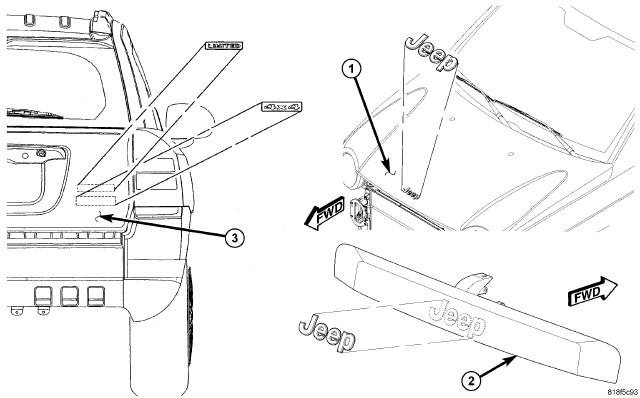 NOTE: Exterior nameplates are attached to body panels with adhesive tape.