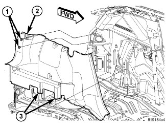 5. Using a trim stick or equivalent, release the retaining clips (2) and remove the liftgate scuff plate (1).