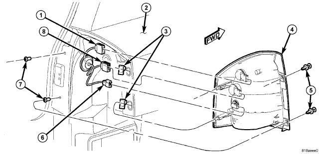 4. Pull the lamp away from the vehicle far enough to access and disconnect the unibody wire harness connectors (1, 6 and 8) from the bulb socket connector receptacles and the pigtail wire connector on the back of the lamp housing.