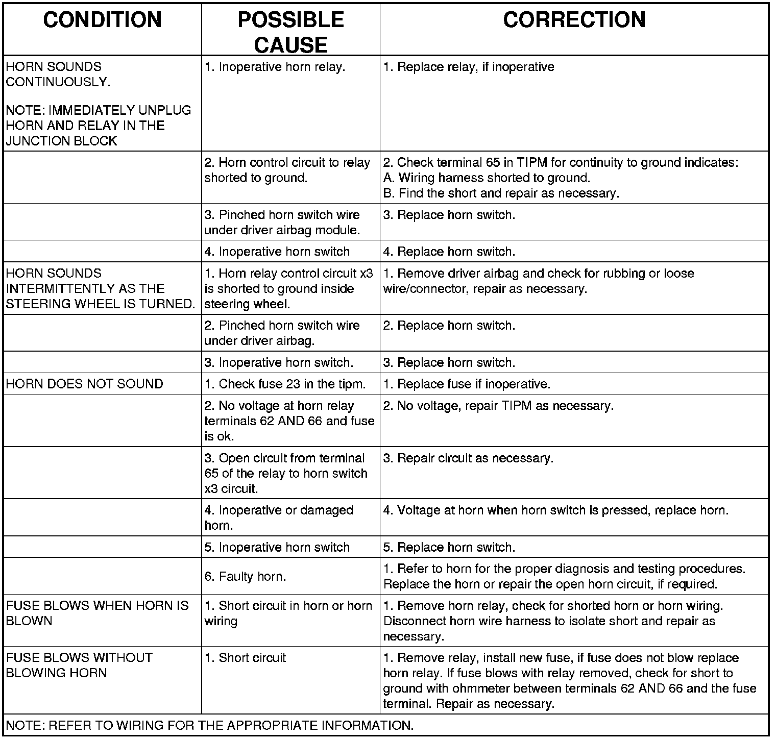 In most cases, any problem involving continually sounding horns can be quickly alleviated by removing the fuses from the Totally Integrated Power Module (TIPM).