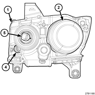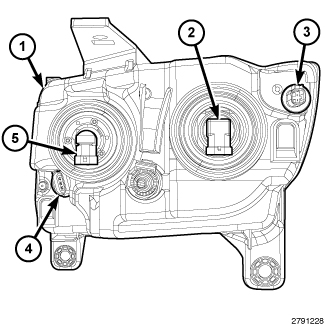 3. Reach behind the front lamp unit to access the bulb opening on the back of the lamp housing (1).