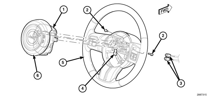 2. Working through the access holes in each side of the steering wheel (5) rear trim cover, remove the two screws (2) that secure the floating horn switch (1) and Driver AirBag (DAB) (6) unit to the steering wheel armature.