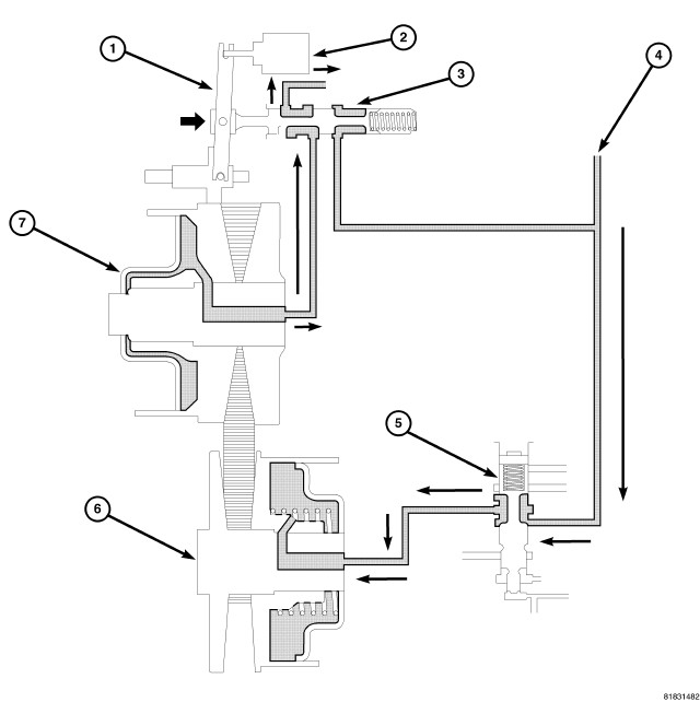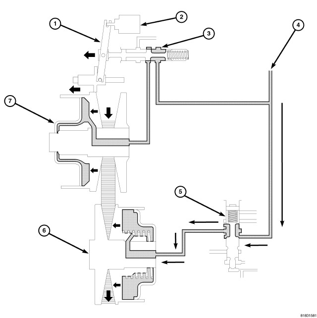 Additionally, the sliding element of the primary pulley moves to the right direction and the ratio control valve also moves to the right side and closes the line pressure circuit; this is a completion of the shift.