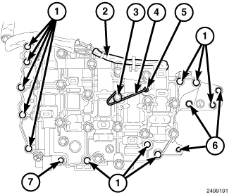 9. Install and tighten the mounting bolts (1) and (7) of the control valve body assembly to 8 Nm (70 in. lbs).