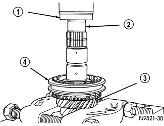 1. Install Bearing Splitter (3) behind 5th speed gear. Remove snap ring (4) at 5th synchronizer hub on input shaft (2).