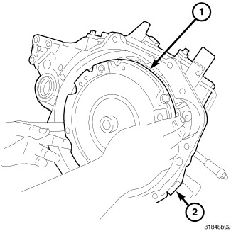 25. Remove four modular clutch-to-drive plate bolts (1). While removing bolts, one tight-tolerance (slotted) drive plate hole will be encountered. When this bolt is removed, mark drive plate and modular clutch assembly at this location. Be sure to align marks upon reassembly.