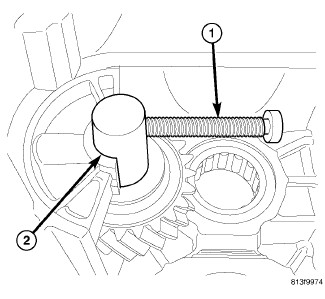 1. Remove reverse idler gear shaft bolt (1) from housing (2).