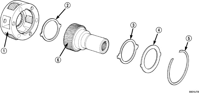 Check the carrier lock ring (4) and both thrust washers (2, 3) for wear or cracks. Replace them if necessary. Also replace the carrier lock retaining ring (5) if bent, distorted, or broken.