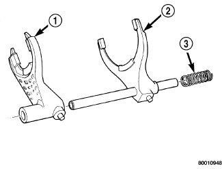 Check condition of the shift forks and mode fork shift rail (2). Minor nicks on the shift rail can be smoothed with 320-400 grit emery cloth.