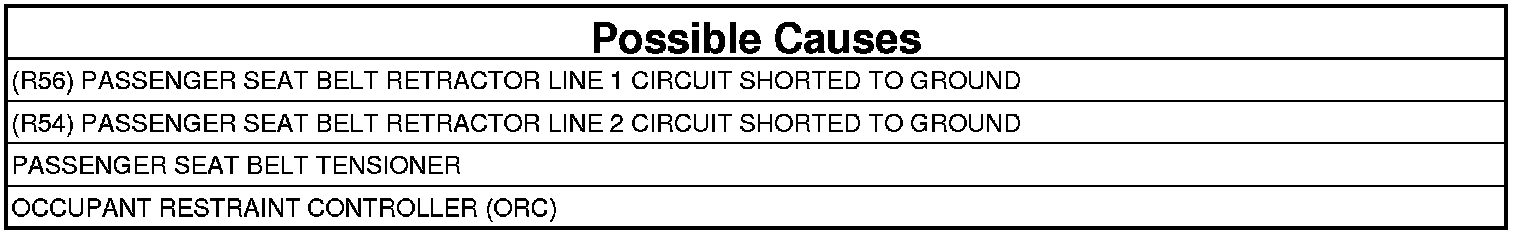 The Occupant Restraint Controller (ORC) monitors the resistance of the Passenger Seat Belt Tensioner circuits. The ORC will set this DTC if it detects low resistance on the Passenger Seat Belt Tensioner circuits.