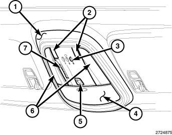 4. Push upward firmly and evenly on the sides of the overhead console housing (1) over the snap clip locations until the snap clips are fully engaged with their receptacles in the overhead console bracket.