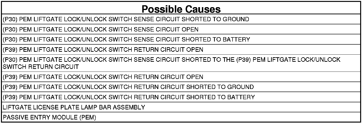 - Repair the short to voltage in the (P30) PEM Liftgate Lock/Unlock Switch Sense circuit.