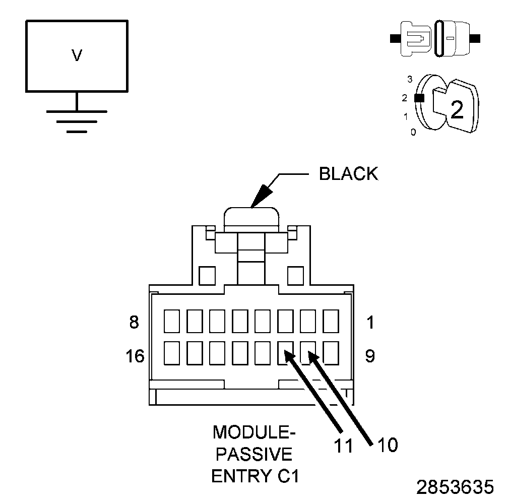 3. Measure the voltage between ground and the (P39) PEM Liftgate Lock/Unlock Switch Return circuit in the PEM C1 harness connector.