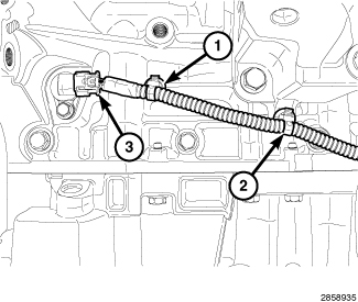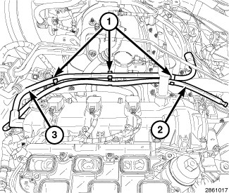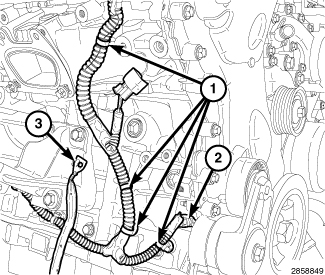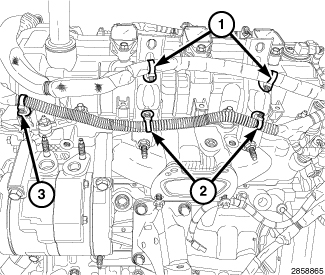 12. Engage one main wire harness retainer (3) to the left cylinder head cover and two retainers (2) to the upper intake manifold support brackets.