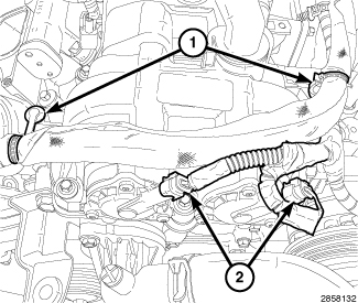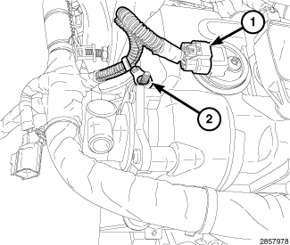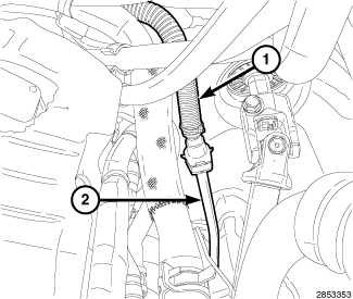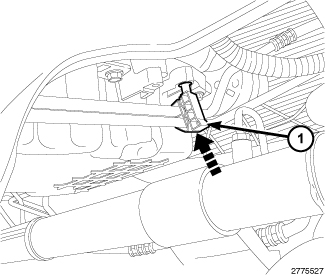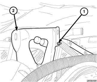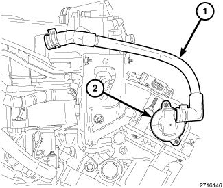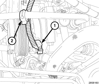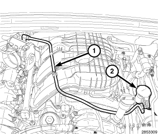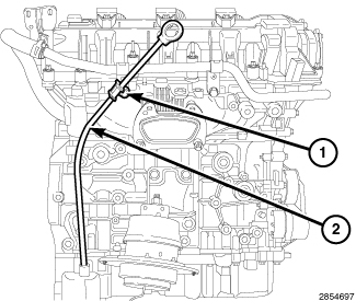 47. If equipped with AWD, engage the transfer case vent hose retainer (1) to the upper intake manifold support bracket (2).