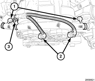 65. Install the make-up air tube (3) to the left cylinder head cover and engage the clips (1) to the transmission breather hose (2).