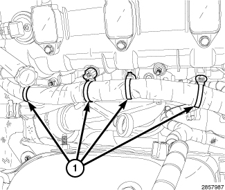 52. Install the lower radiator hose (1) to the engine coolant pump housing.